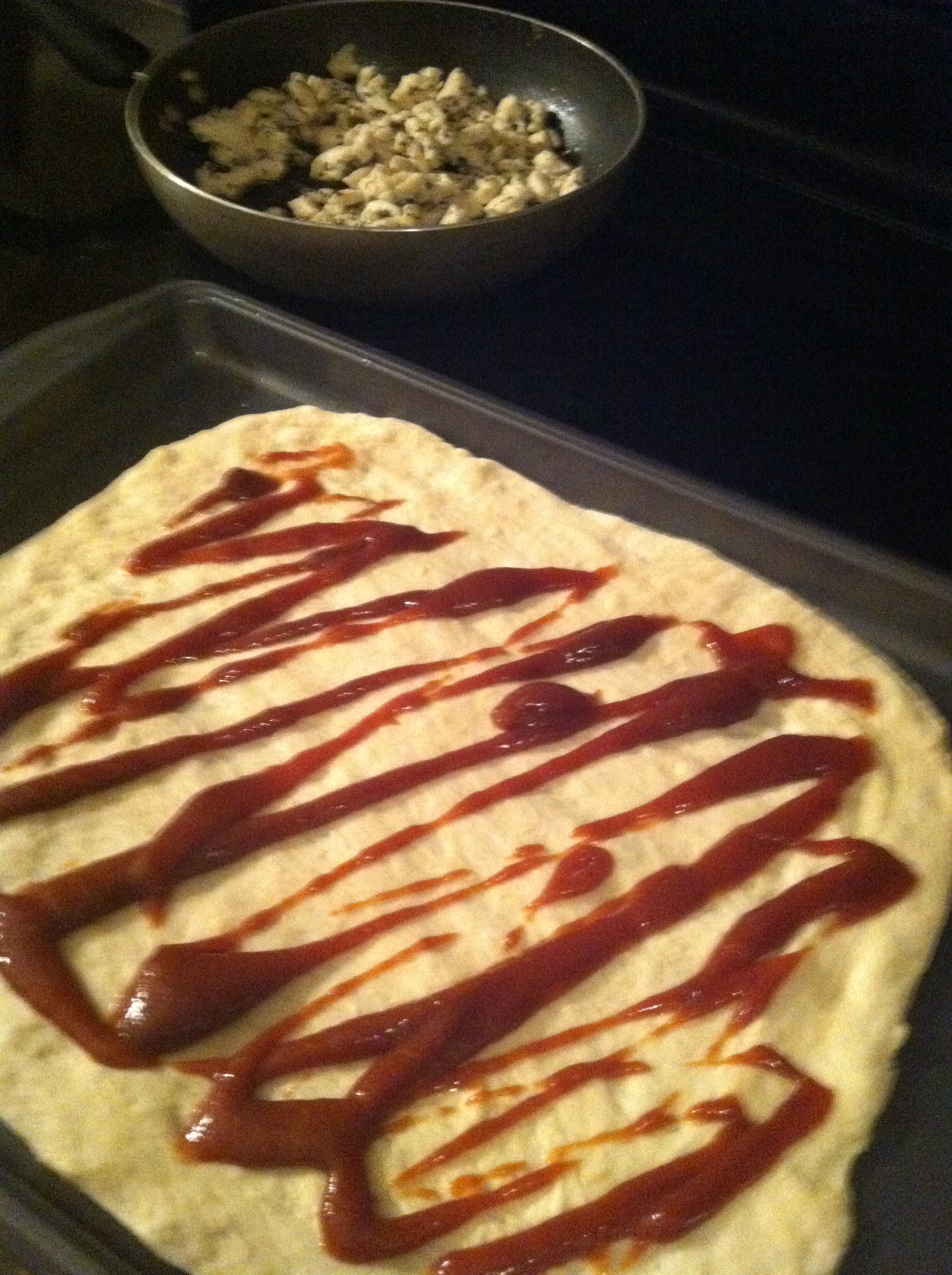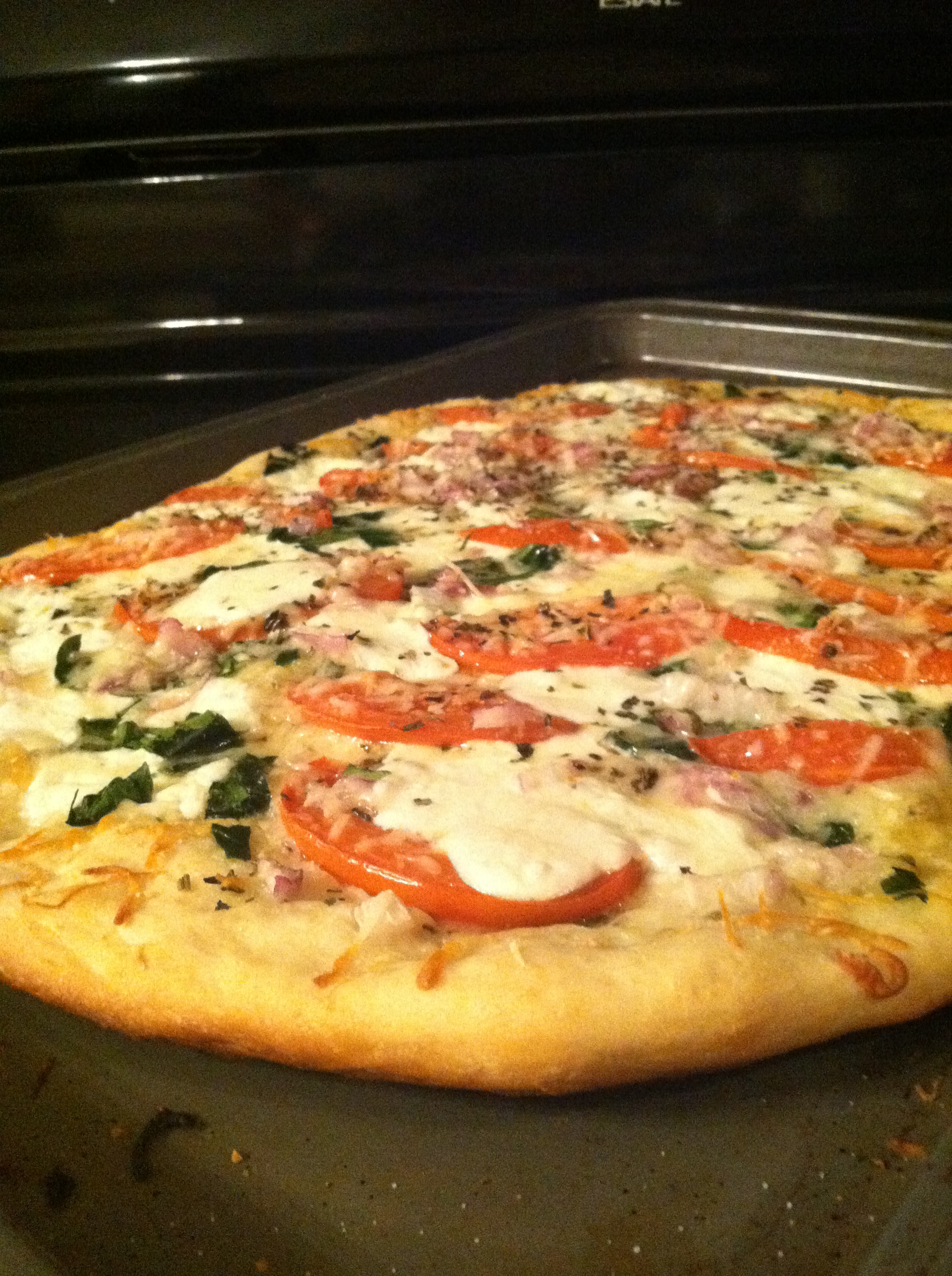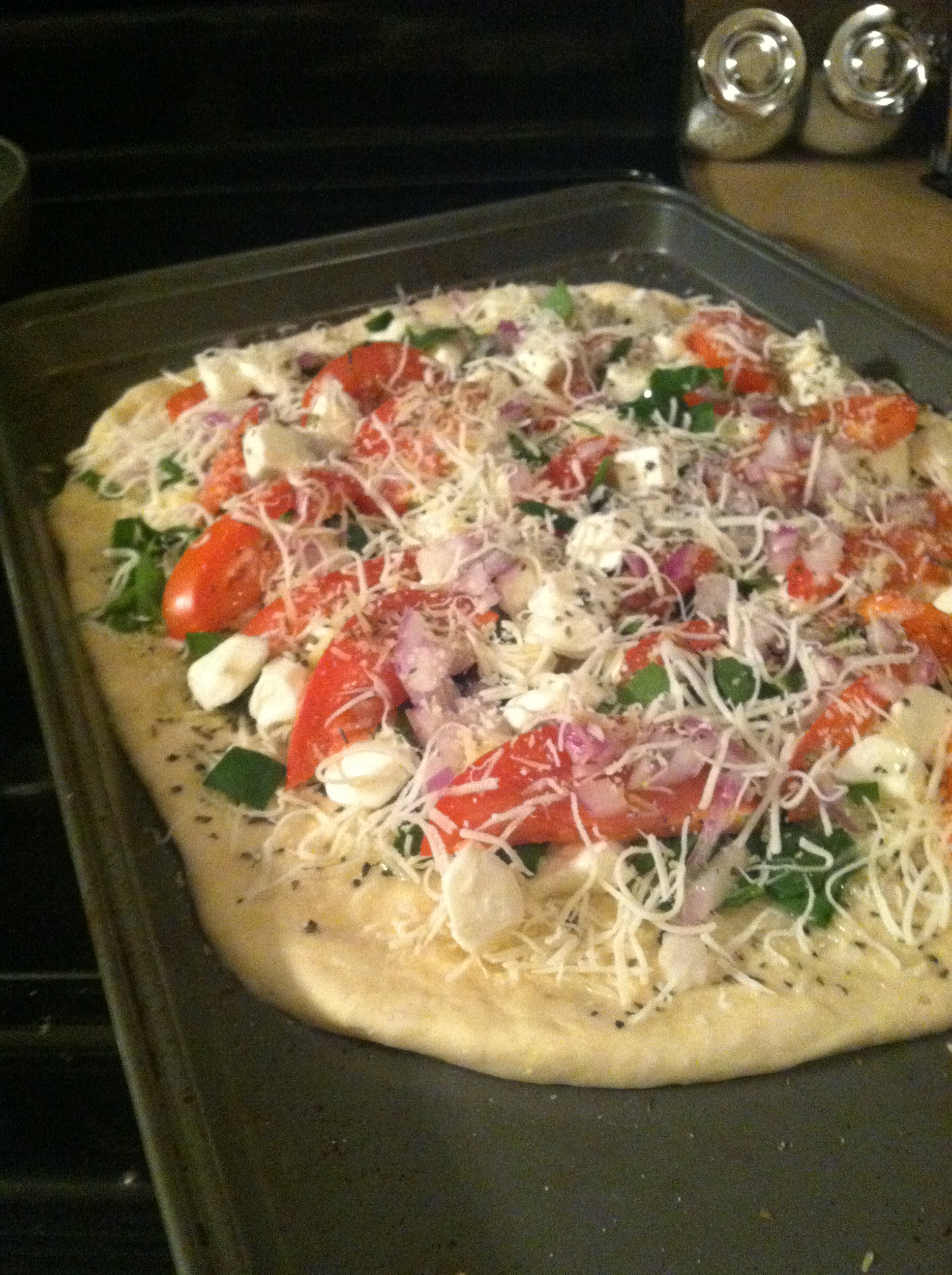 Spread it out evenly on a Pizza Pan. Drizzle some Olive Oil on the dough, sprinkle some basil and garlic powder. Once all the Ingredients are chopped, first lay down a thin layer of Shredded Mozzarella (to help the toppings stick to the dough),