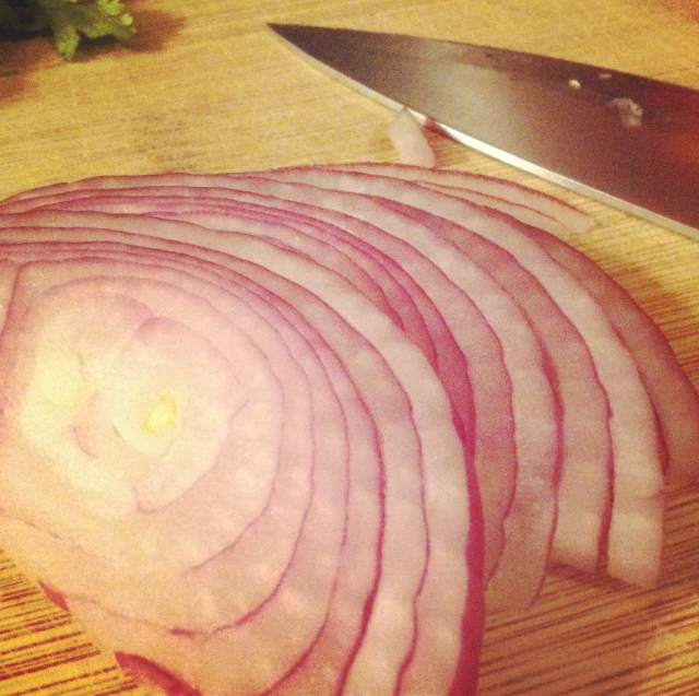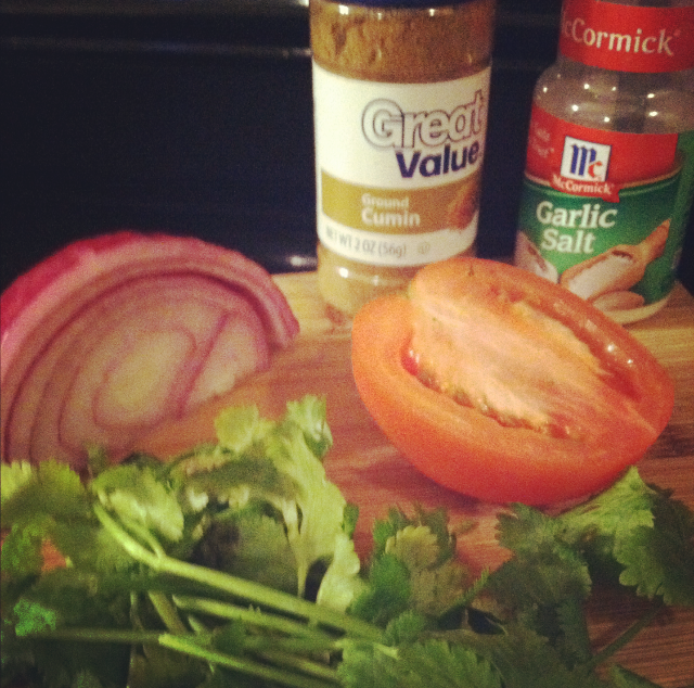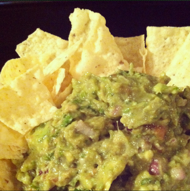 Cut the avocados in half, remove the pit, and mash it up in a bowl. Chop up the onion, tomato and cilantro. This you can chop as fine as you like, I prefer my guacamole on the more chunky side so I don’t chop the onion and tomato very fine.