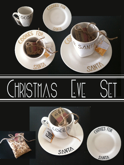 Need a Holiday Tradition! Great fun for Kids who are anxiously awaiting Santa. Use this Mug and Plate for Santa (Mug reads: Cocoa for Santa, Plate reads: Cookies for Santa) and the Reindeer Food is bound to attract those Reindeer (mixed in glitter grabs their attention from the night sky!) Set includes 1 Mug,1 Plate,1 bag of Reindeer Food Sets come in Black or Gold lettering $25